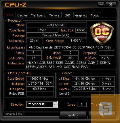 Дальше — больше. Нам дали не просто A8-7600, нам дали инженерный образец. Обычно подобные чипы высылают производителям материнских плат, чтобы они тестировали свои устройства, готовящиеся к выпуску, или Beta-тестировщикам. Полное имя процессора — ZD317095I4468_38/31/16/07_1313, и узнать в нем именно A8-7600 можно только по техническим характеристикам.