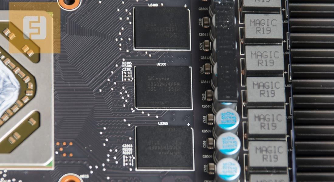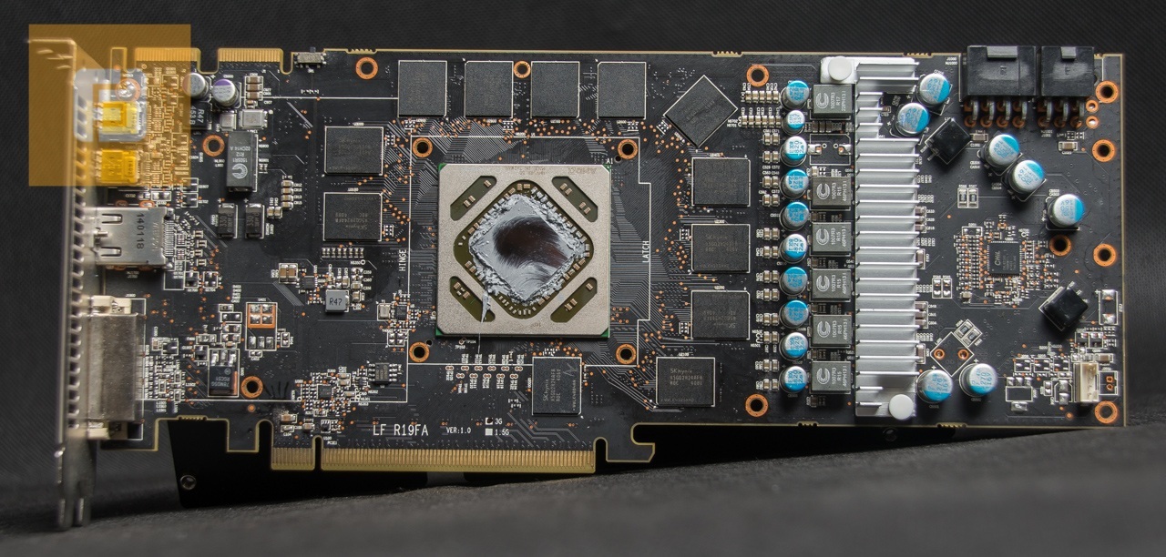 Итак, применяется нереференсная печатная плата. На самом деле, выглядит она немного пустоватой. «Камень» и чипы памяти расположены в стандартном месте. Элементы питания видеокарты охлаждаются большим плоским радиатором. В отличие от референса, здесь используется сразу 11 фаз (один модуль распаян слева, а не в стройном ряду справа). Под нужды GPU отведено 8 элементов. Для памяти — одна фаза. Напомню, что все элементы видеокарты соответствуют стандарту Military Class IV (MIL-STD-810G).
