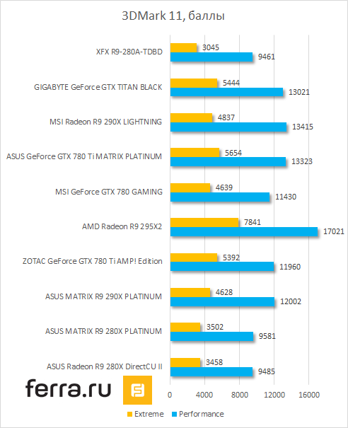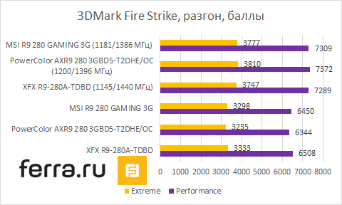 Например, разогнанная до 1145 МГц по чипу и 1440 (5760) МГц по памяти XFX R9-280A-TDBD опережает Radeon R9 280X от ASUS, функционирующую на дефолтной частоте.
