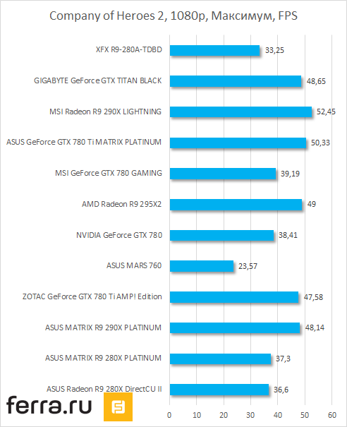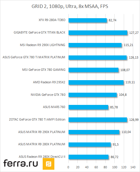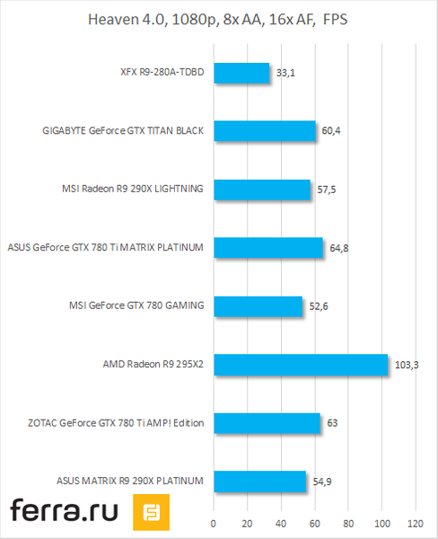 Итак, для начала я узнал, какая из трех Radeon R9 280 оказалась самой быстрой. Здесь все логично, ибо видеокарты выстроились в зависимости от частоты графического процессора. Чип ускорителя XFX функционирует на скорости 1000 МГц. Эта видеокарта и оказалась самой производительной из всей троицы. Давайте сравним ее результаты с остальными графическими адаптерами.