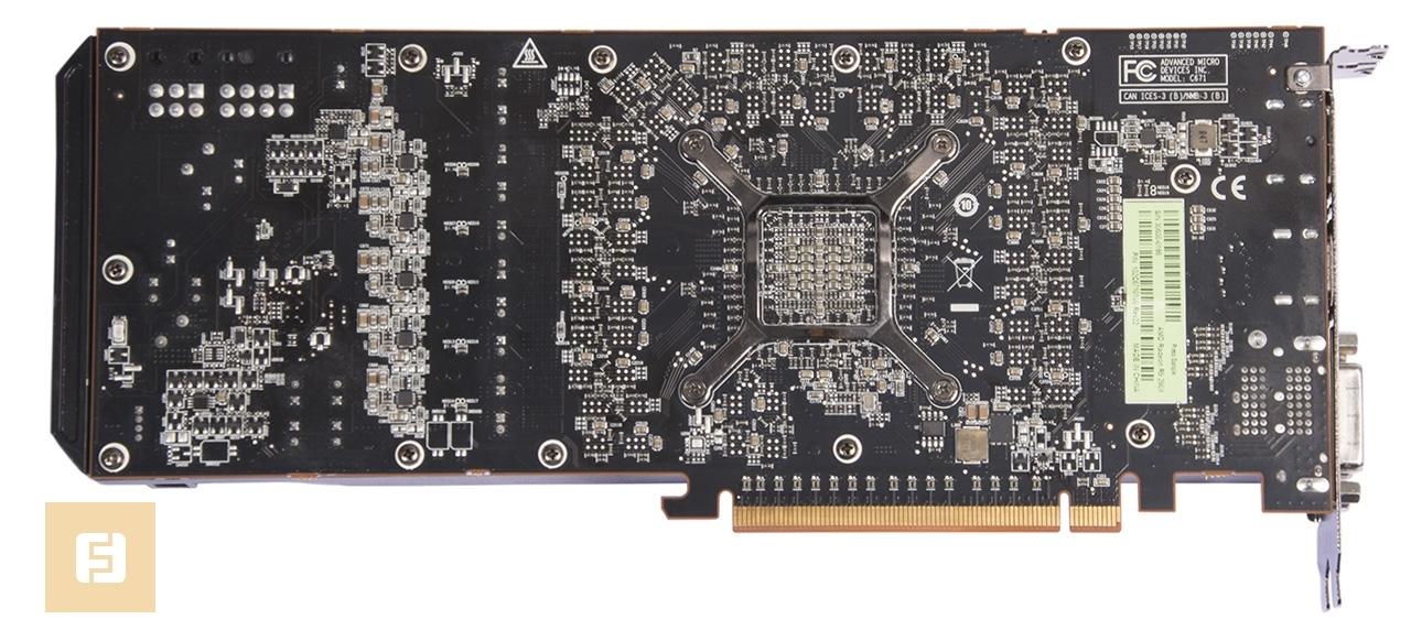 Все основные элементы распаяны на одной стороне печатной платы. Вокруг чипа образовалось кольцо из шестнадцати микросхем памяти производства SK Hynix. В «хвосте» устройства распаяны элементы питания. Radeon R9 290X может похвастать 7-фазной цепью, функционирующей по незамысловатой схеме 5+1+1.