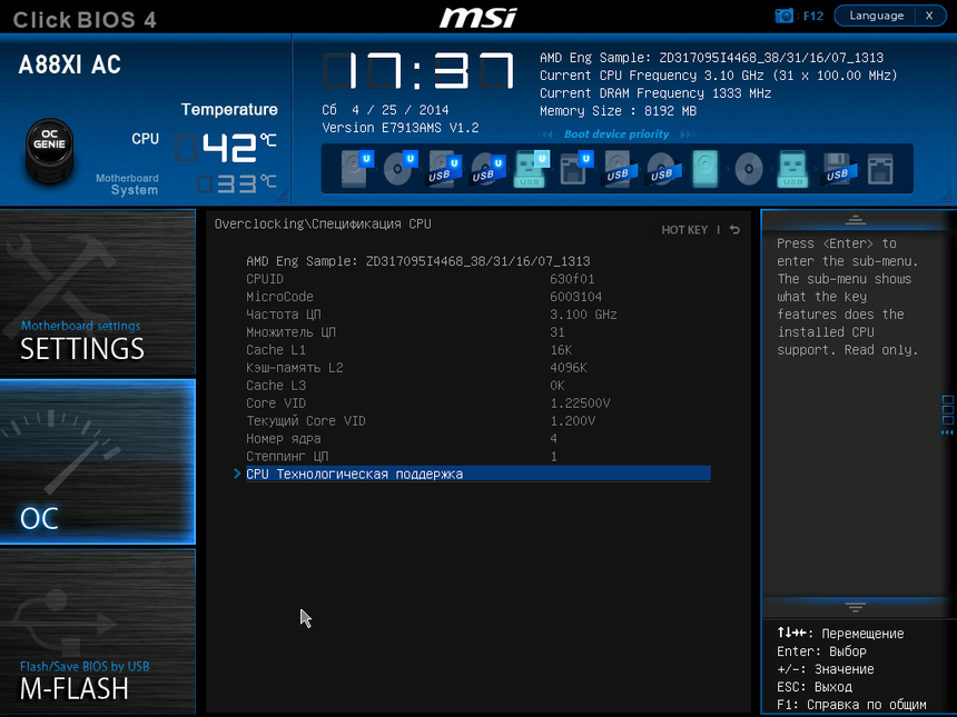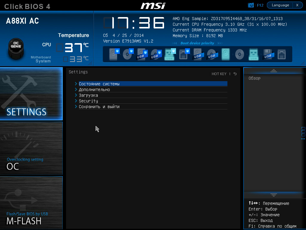 Главная страница UEFI MSI A88XI AC