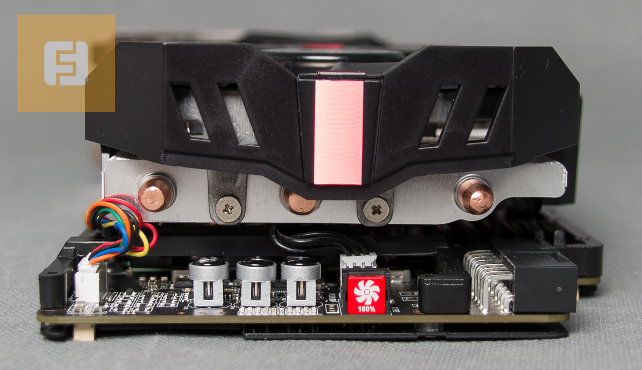 Примечательной особенностью обозреваемой видеокарты является наличие интегрированной панели управления. Красная клавиша с изображенным вентилятором позволяет моментально увеличить обороты вентилятора до максимума. Кнопки «плюс/минус» регулируют напряжение питания GPU (визуально отображается при помощи нескольких LED-индикаторов), а клавиша SafeMode, как мы уже сказали, откатывает устройство к дефолтным настройками.