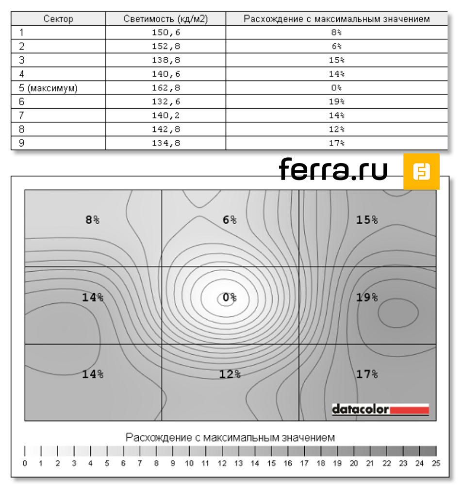 К несчастью, равномерность подсветки — не то, чем может похвастаться ASUS PA329Q. На изображении слева видно, что чем ближе к краям дисплея, тем изображение становится темнее. Разница с центром достигает внушительных 19%. В меню присутствует компенсации подобной неравномерности, результат её неважной работы можно видеть на графике справа. К тому же активация подобного режима возможна не во всех предустановленных цветовых схемах и лишает вас возможности регулировать уровень яркости, что может повлечь к очевидному дискомфорту.