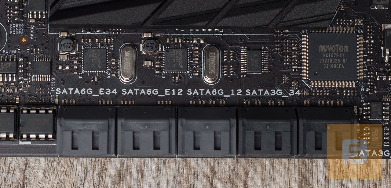 Порты SATA расположены в привычном месте. Десять пластиковых разъемов занимают весьма приличное пространство. SATA II окрашены в черный цвет, SATA 3.0 — в серый.