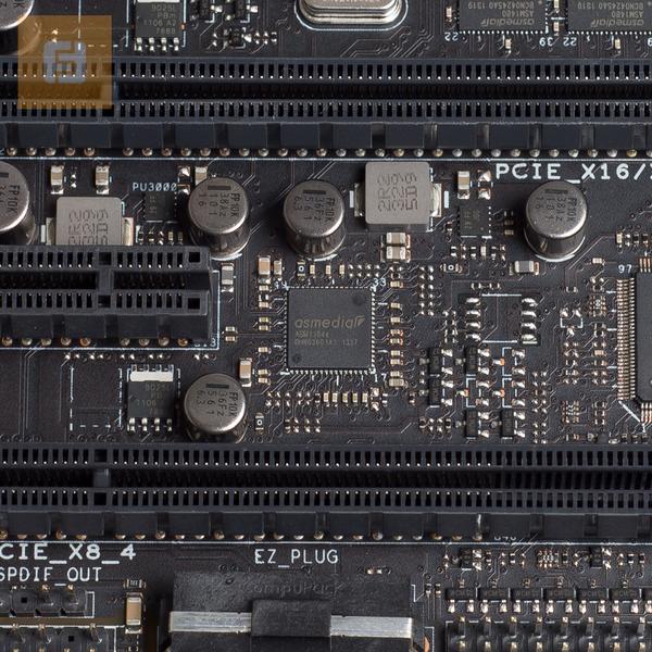 • Четыре «многоножки» ASMedia ASM1480 — «разделители» шины PCI Express x16.