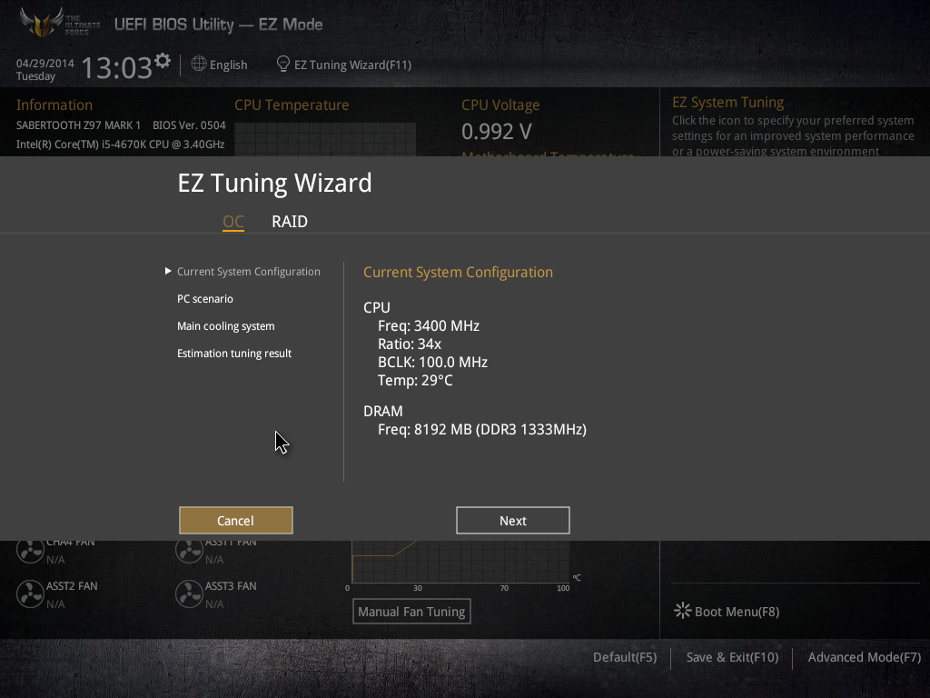 BIOS также оснащен встроенным помощником по разгону системы EZ Tuning Wizard. Приведем пример настройки нашего тестового стенда. Сначала программа определяет конфигурацию системы, процессор и память. Затем EZ Tuning Wizard предлагает пользователю определиться с основным назначением десктопа. Третий этап предлагает на выбор четыре типа используемых в системе процессорных кулеров: боксовый, башенный, СВО и «я не уверен». После этого программа демонстрирует, насколько увеличилась производительность центрального процессора и оперативной памяти. Забавно, что авторазгон CPU, если пользователь выбрал башенный кулер, составляет 32%, а если была выбрана СВО — всего 35%.