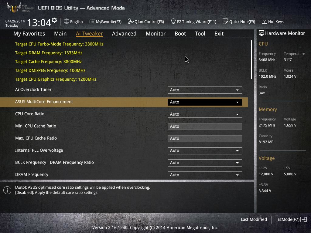 В меню Ai Tweaker, как и всегда, расположены основные настройки по разгону процессора и памяти. В плане функциональности ничего не поменялось, ведь мы, по сути, имеем дело с все теми же процессорами Haswell. Есть большой набор опций, позволяющий спокойно разгонять как «камень», так и «мозги».