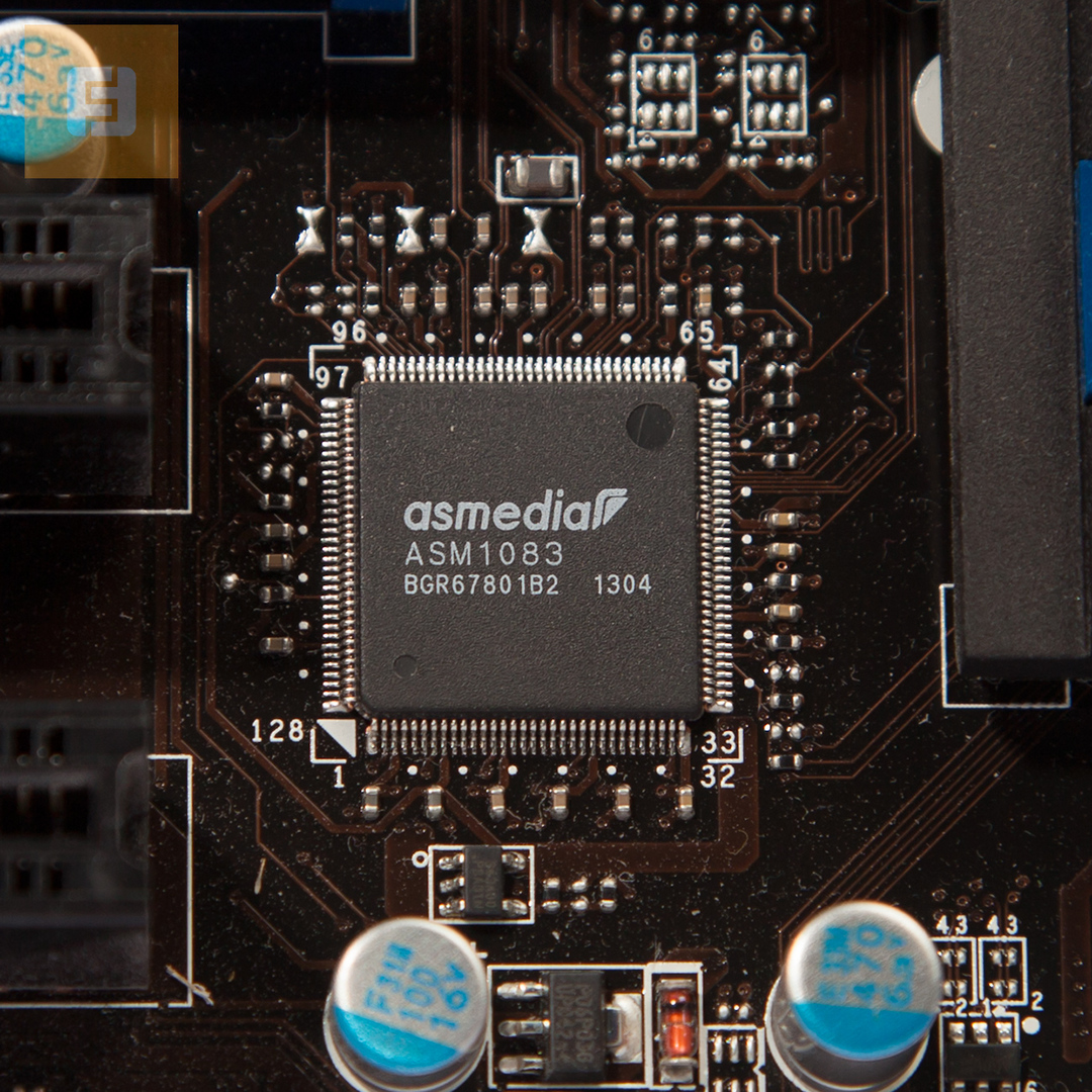 Распаянный на плате контроллер ASMedia ASM 1074 позволяет развести дополнительные порты USB 3.0. За переключение между портами ввода-вывода изображения отвечает контроллер ASMedia ASM 1442K. Благодаря распаянному контроллеру ASMedia ASM 1083 осуществляется поддержка устаревшего PCI.