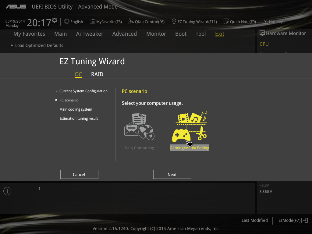Для неопытных пользователей существует помощник EZ Tuning Wizard, позволяющий произвести настройку системы поэтапно с помощью нескольких вопросов. Кстати, здесь присутствует авторазгон «камня»: в арсенале есть как профиль разгона при помощи воздушного кулера, так и при помощи СВО.