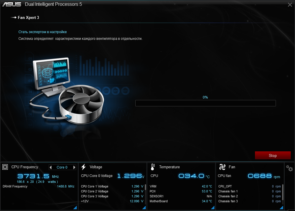 Компонент 5-Way Optimization позволяет выбрать и настроить профили энергосбережения ПК. Также здесь можно получить информацию о текущем состоянии ПК: энергопотреблении процессора, скорости вращения вентиляторов, температур компонентов и их вольтаже.