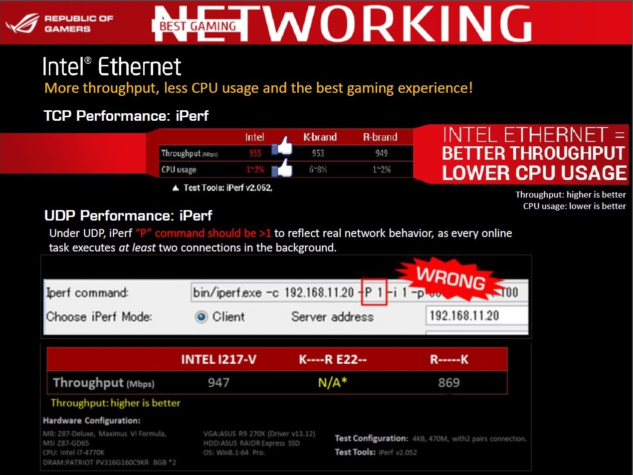 Как известно, некоторые производители материнских плат в своих геймерских решениях используют сетевой контроллер Qualcomm, больше известный под названием Killer E2200. В то же время в ASUS всецело доверяют мощному чипу Intel, который, если верить слайдам, в большинстве оказывается эффективнее своего прямого конкурента.