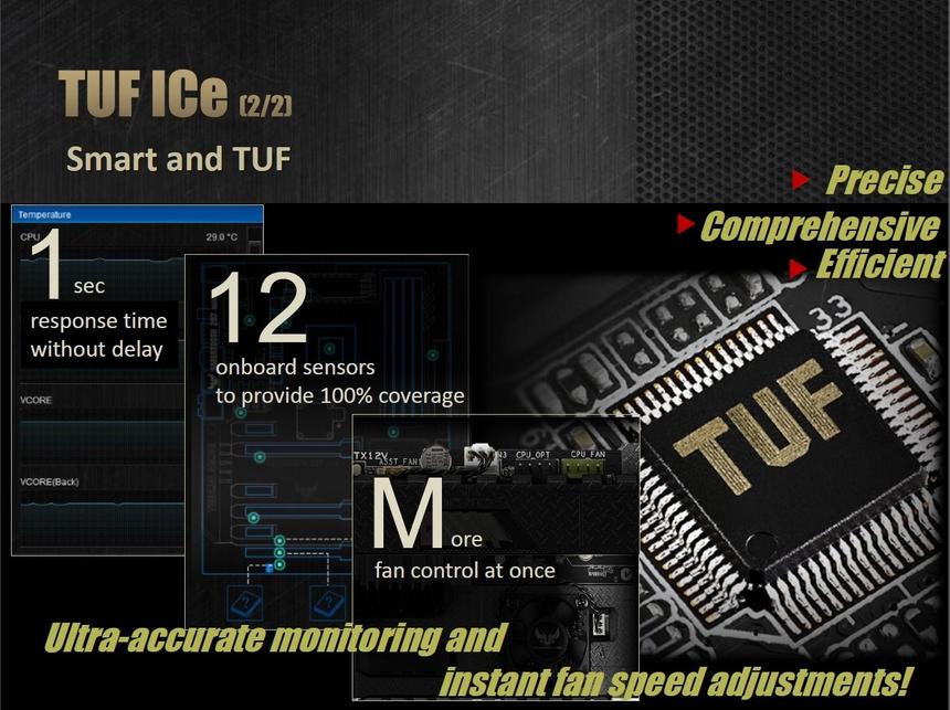 Технология TUF ICe, а точнее, одноименный контроллер осуществляет полный мониторинг системы. Проследить за показателями можно как при помощи программного обеспечения, так и в UEFI BIOS.