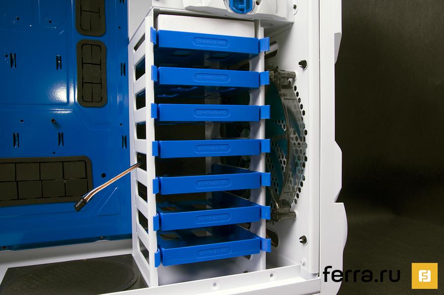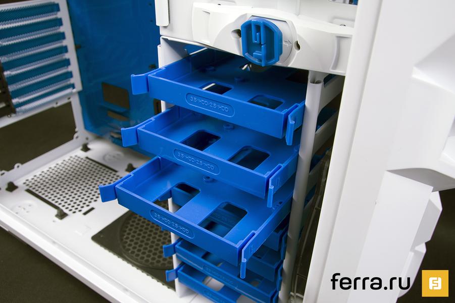 Накопители и устройства для 5,25-дюймовых корзин устанавливаются в специальные салазки. В случае с жесткими дисками и SSD придется поработать отверткой. Оптические приводы и другие 5,25’’ девайсы закрепляются при помощи специальных пластиковых защелок. Как уже было сказано, GT-S White Edition позволяет установить до семи 2,5/3,5’’ накопителей и до пяти 5,25’’ устройств.