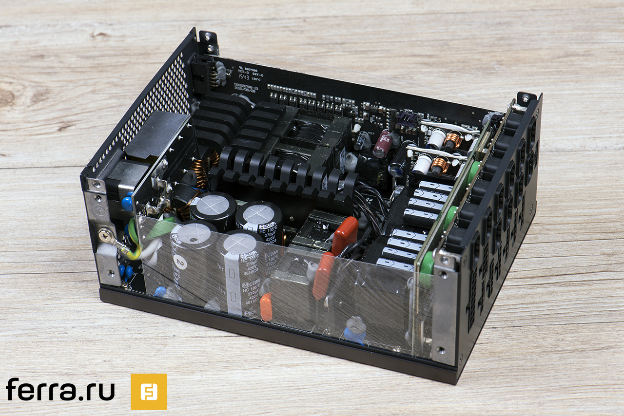 Как известно, Cooler Master сама не производит блоки питания. Конкретно модель MasterWatt Maker 1200 сделал контрактный производитель Enhance. На фотографии ниже видно, что сделал на совесть. Придраться к качеству сборки нереально.