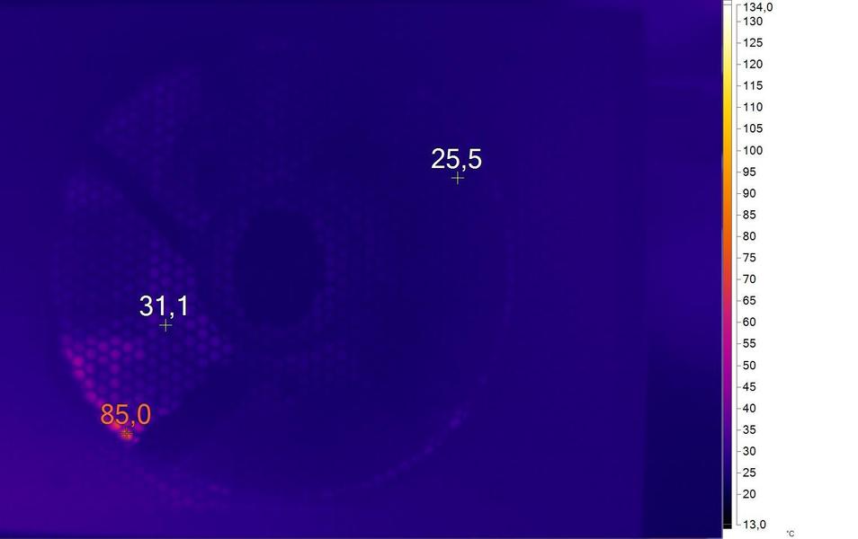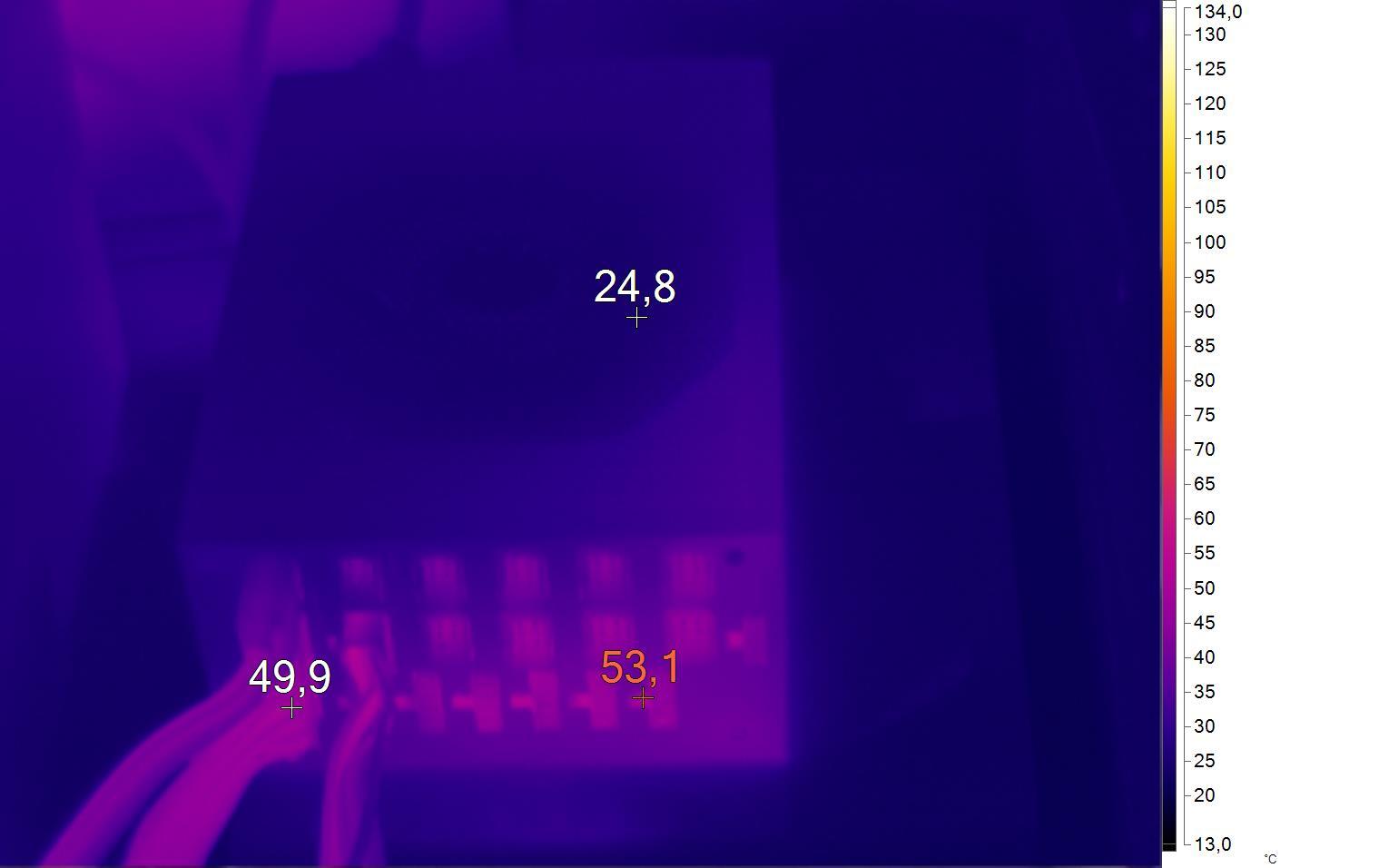 Ниже приведены термоснимки при нагрузке 850 Вт с вращающимся на частоте 960 об/мин вентилятором. тестирование длилось четыре часа. Самым горячим, что логично, оказался участок, где потоки воздуха не выходят наружу. Там распаяны DC-DC-преобразователи линий +3,3 В и +5V. Не зря они оснащены твердотельными конденсаторами и термопрокладками.