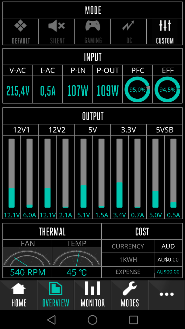 Программа функциональная, но работает только с MasterWatt Maker 1200. Та же Corsair Link представляет универсальное средство по мониторингу и управляет всеми вентиляторами, подключенными к материнской плате. Cooler Master Connect следит за всеми показателями блока питания. Информация выдается как в таблице, так и в виде онлайн-графиков. Есть настраиваемый счетчик затраченной электроэнергии. Рубль не поддерживается.