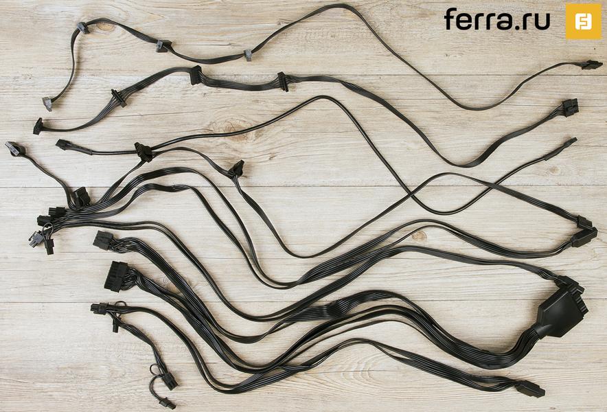 Блок питания полностью модульный, то есть отстегиваются абсолютно все кабели. Опять же, стандартное решение для подобного рода устройств. Понятно, что без 24- и 8-пинового кабелей для питания матплаты и процессора не обойтись, но съемными их делают исключительно для того, чтобы было проще собирать компьютер. Общее количество кабелей, их длина и количество отображены в таблице.
