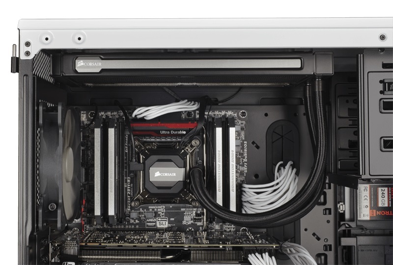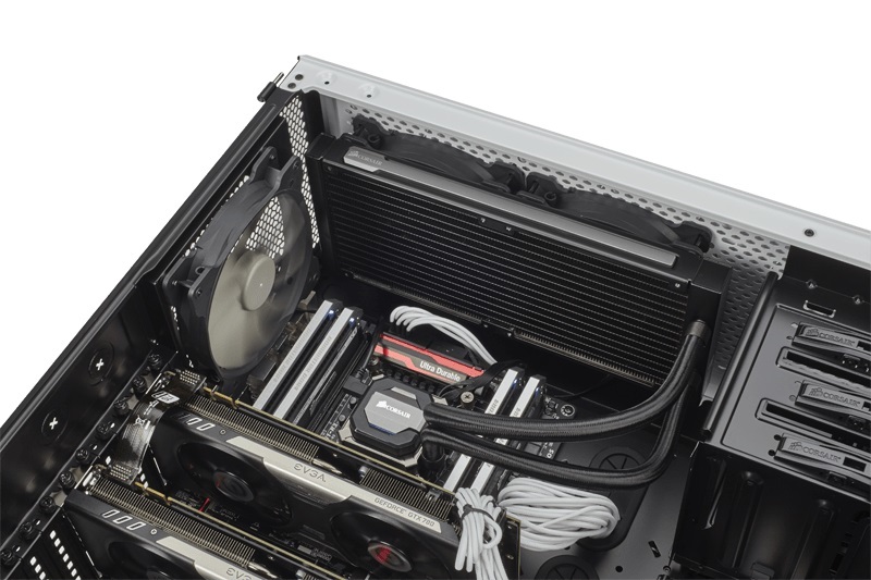 Вся сложность установки H110i GT заключается в крепеже радиатора на стенке корпуса. Самый распространенный вариант — на верхней панели. Менее очевидный — на передней стенке. В продаже есть кейсы с посадочным местом под СВО на днище. Как видите, во всех случаях установка устройства зависит от выбранного корпуса.
