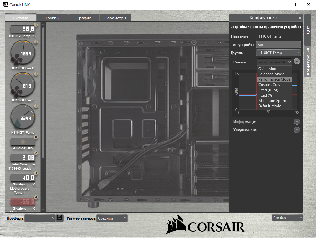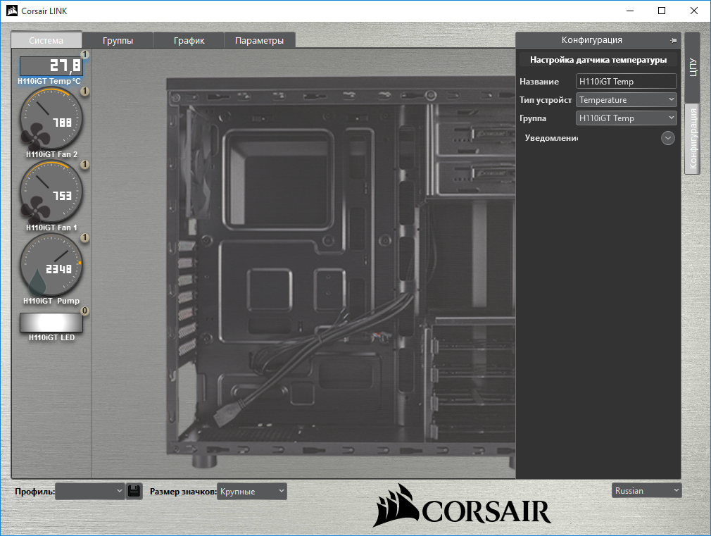 Программа Corsair Link частично переведена на русский язык. Она следит за температурными показателями системы и управляет вентиляторами «водянки». Основное меню разделено на четыре вкладки: «Система», «Группы», «График» и «Параметры». Приложение мониторит такие параметры, как температура с датчика водоблока H110i GT, скорость вращения вентиляторов и ротора, а также температуры материнской платы, процессора и видеокарты.