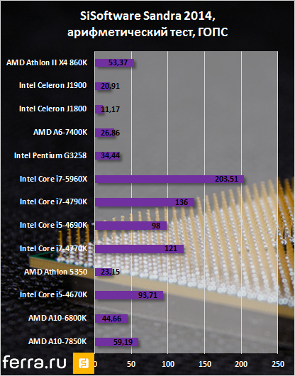 При практически идентичной стоимости Athlon X4 860K заметно, с двукратным преимуществом, опережает AMD A6-7400K в SiSoftware Sandra 2014. Сказывается наличие у гибридника всего одного модуля Steamroller и, соответственно, двух физических ядер.