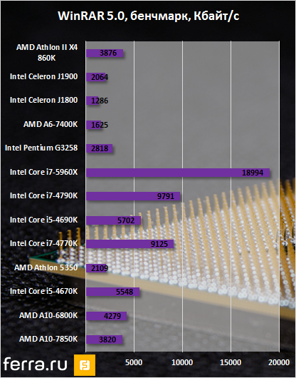 Архиватор 7Zip, согласно нашей методике, работает с одним потоком. И здесь уже впереди юбилейный «пень» от Intel.