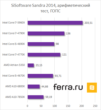 Синтетика любит многопоточность. Поэтому неудивительно, что стенд с Core i7-5960X на борту набрал наибольшее число баллов.