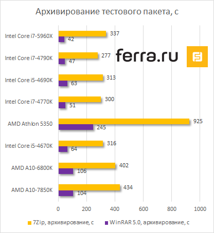 Архивирование в 7Zip — вот паттерн, в котором 8-ядерник спасовал. Сказывается более низкая тактовая частота, чем у других Haswell-процессоров.