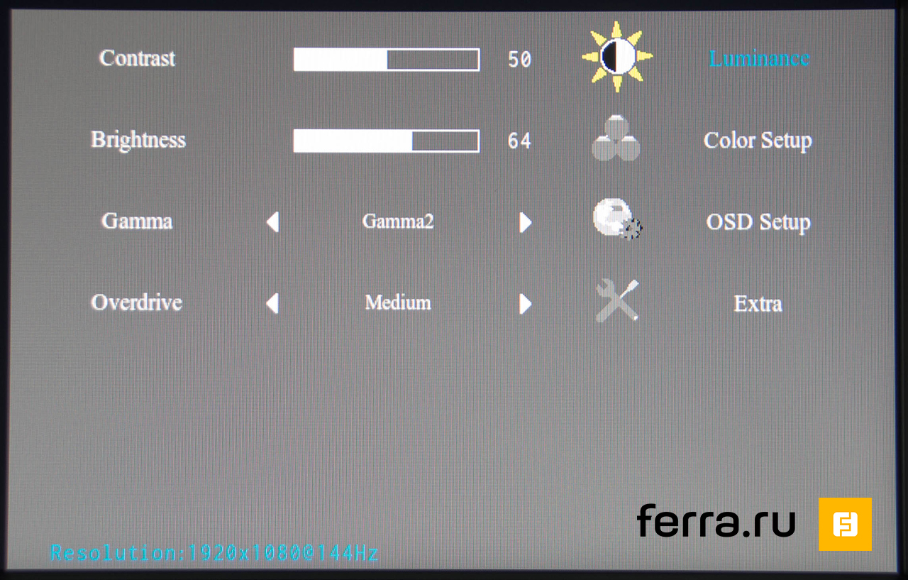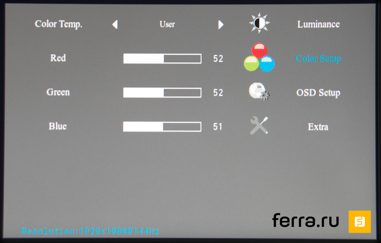 Меню AOC G2460PG краткое и понятное, запутаться в нём невозможно. Все манипуляции производятся с помощью четырёх клавиш: двух стрелок, ввода и выхода. На первый взгляд кажется, что монитор не имеет предустановленных цветовых схем. Однако они кроются в графе «Температура». Всего там 5 режимов: Warm, sRGB, Normal, Cool и User. Также есть три предустановленных варианта гаммы (в нашем семпле «правильным», то есть соответствующим 2,2, был второй) и ручная регулировка каналов RGB. Вы можете самостоятельно выбрать «скорость» матрицы, хотя она, конечно, дана не в миллисекундах, а в относительных величинах.