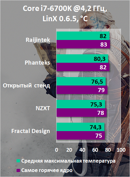 Тестирование проводилось в два этапа. Собирался стенд, фотографии полностью готовых систем — ниже. Затем один час нагружали центральный процессор в LinX 0.6.5, а после — в «Ведьмак 3: Дикая Охота» (локация — Новиград). Результаты на графиках ниже. Вентиляторы систем охлаждения, а также корпусные «ветродуи» работали в автоматическом режиме.