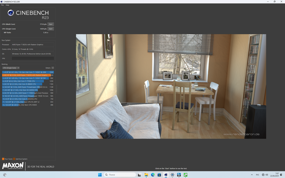 С чем можно сравнить чип? В тестах Notebookcheck, в Cinebench R23 наш Ryzen 7 5825U набирает одинаковые баллы с первым поколением процессоров Apple M и Intel Core i5-13420H. А еще он обгоняет в многоядерном режиме Qualcomm Snapdragon X Elite (X1E-78-100). Мелочь (потому что это самый медленный Elite в линейке), но все же приятно.