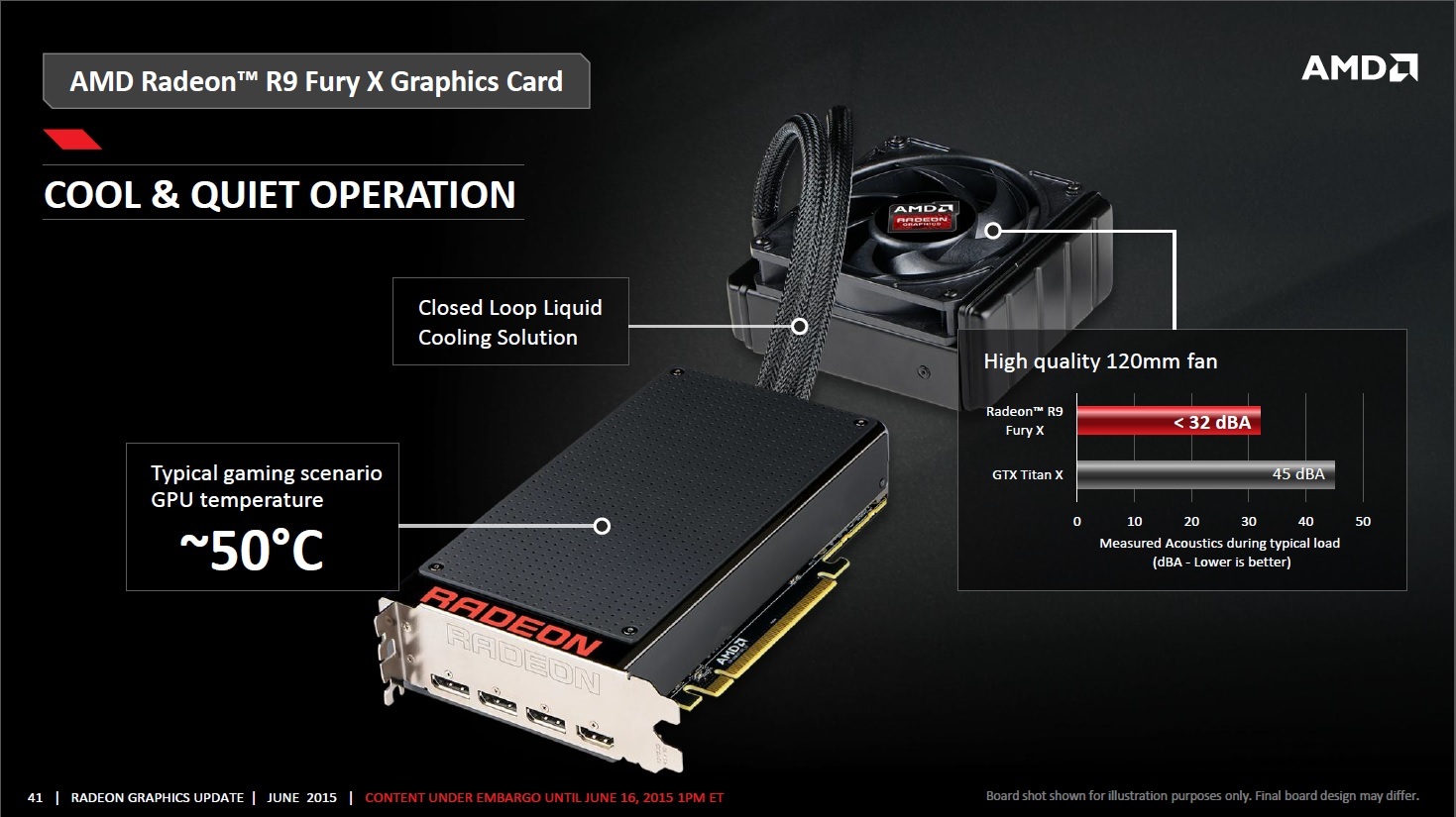 Доверимся информации AMD. СВО не позволяет прогреться графическому процессору выше 50 градусов Цельсия при максимальной нагрузке. При этом, если верить данным AMD, то максимальный уровень шума Radeon R9 Fury X меньше 32 дБ. Это практически бесшумно. Например, референсный GeForce GTX TITAN X работает заметно громче.
