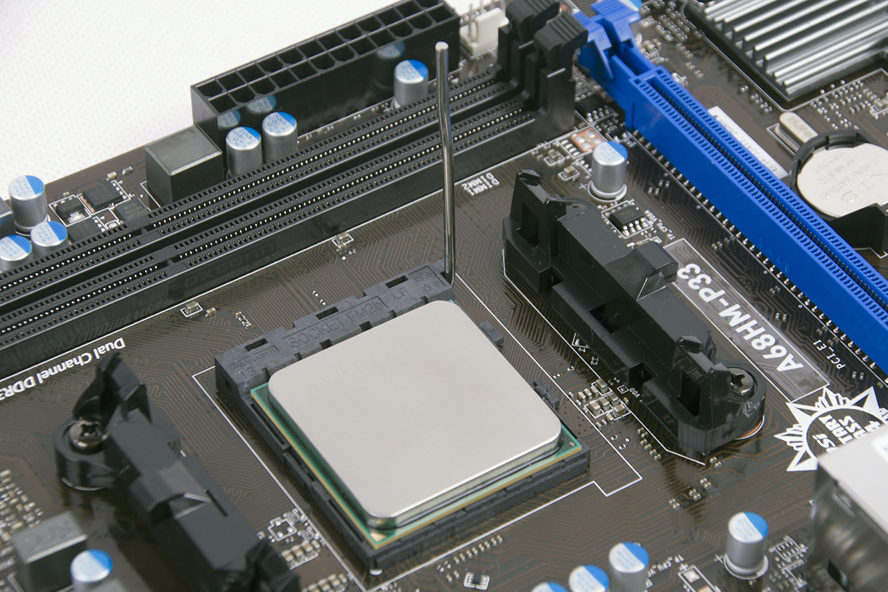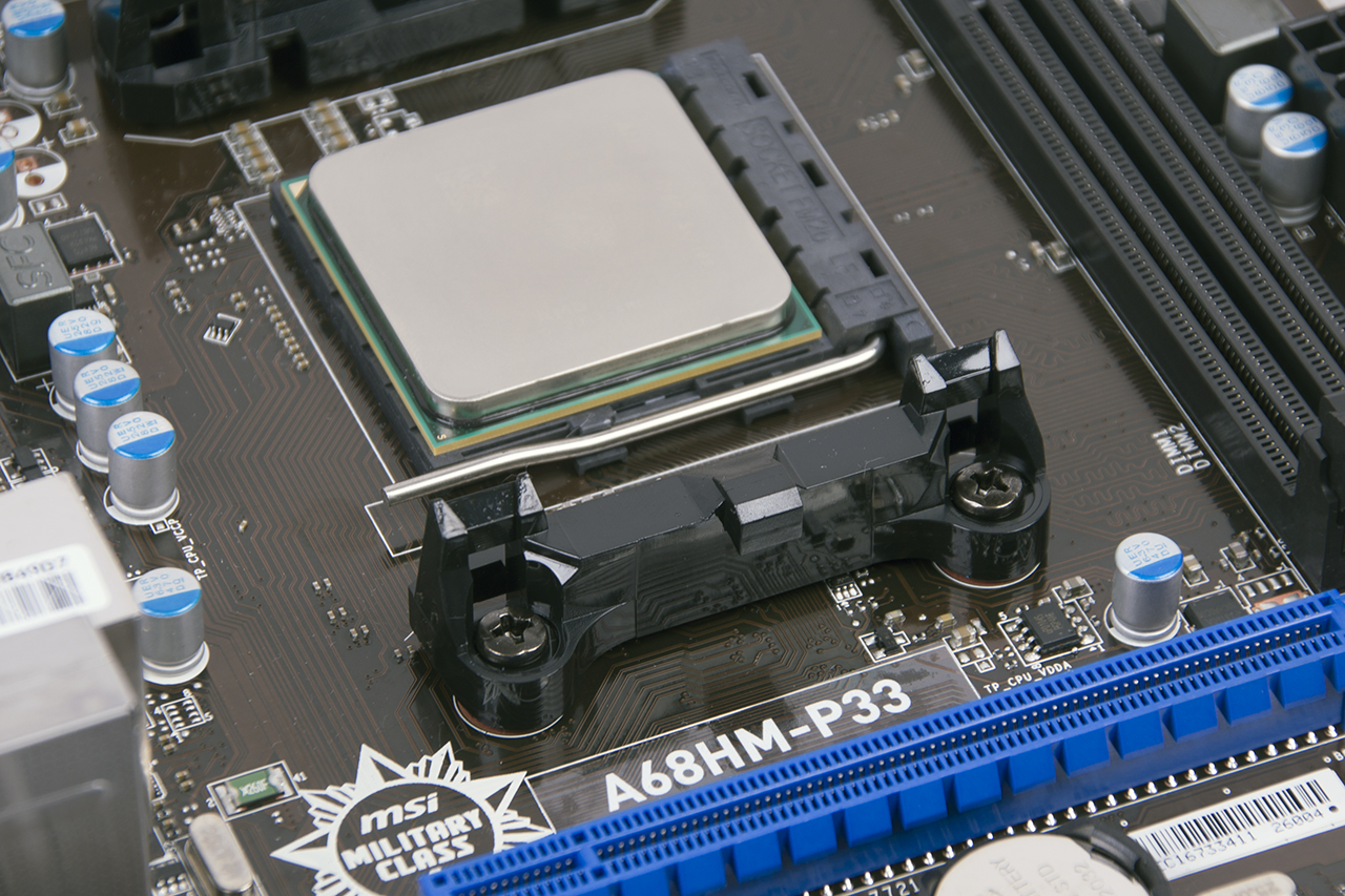Начинаю с установки центрального процессора в специальный слот. Компании AMD и Intel используют принципиально разные конструкции сокетов. Так, у «красных» контактные ножки находятся непосредственно на процессоре. А у Intel — в гнезде. Для того чтобы установить процессор AMD в сокет (FM/AM — без разницы, они имеют схожую конструкцию, но могут быть рассчитаны на разное число ножек), необходимо поднять металлический рычаг, вставить ножки в соответствующие микроотверстия и вернуть рычаг в исходное положение. Контакты процессора тем самым замкнутся с контактами сокета материнской платы и он (процессор) будет надежно зафиксирован.