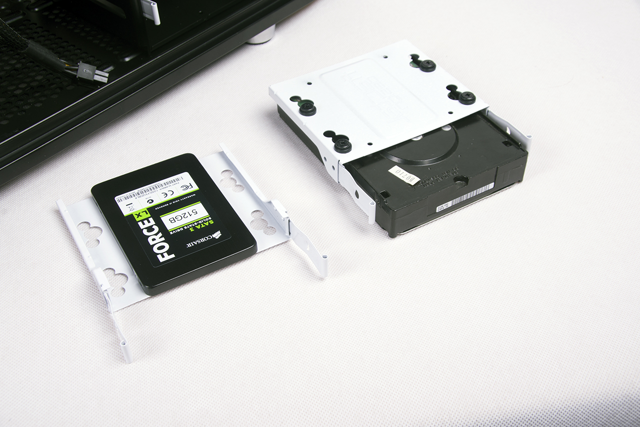 Корзины для жестких дисков могут быть расположены по-разному. В случае с приведенным примером салазки вынимаются на меня. Я установил накопители таким образом, чтобы доступ к их разъемам осуществлялся с другой стороны корпуса, так как в демонстрационной системе используется всего один жесткий диск и один SSD. Таким макаром удается более опрятно скрыть провода за шасси. Однако, если в вашей системе будет использоваться большое число накопителей, а также к ним потребуется постоянный доступ, то рациональнее будет установить их разъемами к ближней левой боковой стенке. В таком случае, чтобы отключить/подключить жесткий диск потребуется снять всего одну крышку.