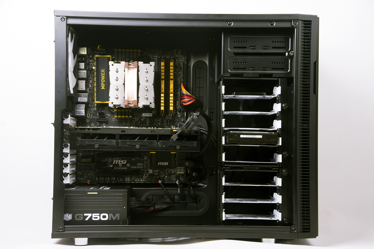Что ж, процессор установлен, на него водружен кулер, да и оперативная память инсталлирована в правильные слоты DIMM. Пора подготавливать все это железо к переезду непосредственно в компьютерный корпус. Для демонстрации я выбрал модель Fractal Design Define R5. Она имеет форм-фактор Full tower, а это значит, что материнская плата будет находиться в вертикальном положении. Подобный тип корпусов является самым распространенным. Так что для демонстрации он подходит как нельзя лучше.