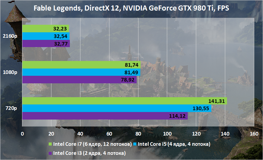 Тестирование проводилось с тремя процессорами Intel и двумя видеокартами: GeForce GTX 980 Ti и Radeon R9 Fury X. Процессорозависимость наблюдалась лишь в очень низком разрешении 1280х720 (720p), что неудивительно. В более высоких разрешениях стенды продемонстрировали практически одинаковые результаты.