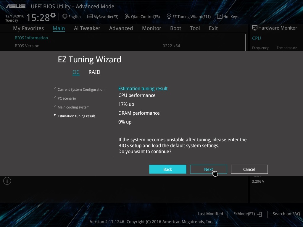 PRIME Z270-A и STRIX Z270E GAMING оснащены функцией авторазгона EZ Tuning Wizard. В зависимости от типа системы охлаждения «волшебник» предложит следующие варианты: боксовый кулер — 12% оверклок чипа и 0% памяти; воздушное охлаждение — 15% и 0%; водяное охлаждение — 17% и 4% соответственно. Маловато будет!