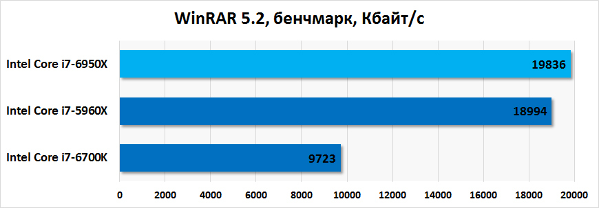WinRAR — наглядный пример, когда прирост производительности оказывается непропорционален увеличению количества ядер. По крайней мере, такая картина наблюдается в версии программы 5.2, хотя архиватор поддерживает многопоточную работу. Дело в том, что при сжатии данных алгоритмами WinRAR нагрузка на ядра и потоки распределяется равномерно, но сам процессор не загружается на все 100%. В итоге Core i7-6950X во встроенном бенчмарке опережает Core i7-5960X всего на 4%. А вот Core i7-6700K серьезно отстает от 8-ядерного и 10-ядерного чипов. Сказывается в том числе и разница в объеме кэша третьего уровня. Большая часть словаря, используемого для компрессии данных, помещается в SRAM, поэтому система реже обращается к оперативной памяти.