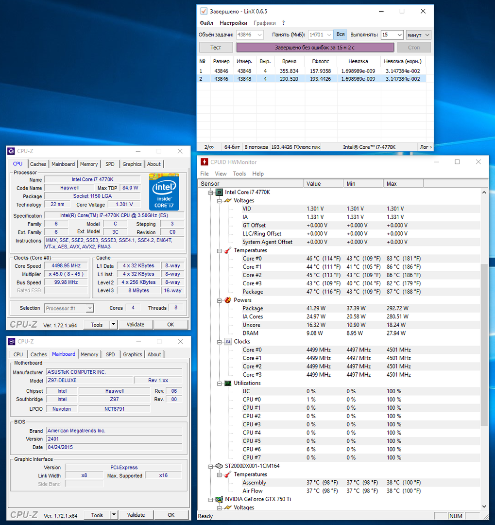 К сожалению, дальнейшее увеличение частоты и напряжения постоянно приводило к возникновению ошибок в LinX 0.6.5. И все же необходимо понимать, что математический пакет Linpack — это очень серьезное испытание для любого центрального процессора. Абсолютное большинство других ресурсоемких приложений не сможет так загрузить чип. Вот и Core i7-4770K с другим софтом при частотах 4600-4700 МГц работал абсолютно стабильно.