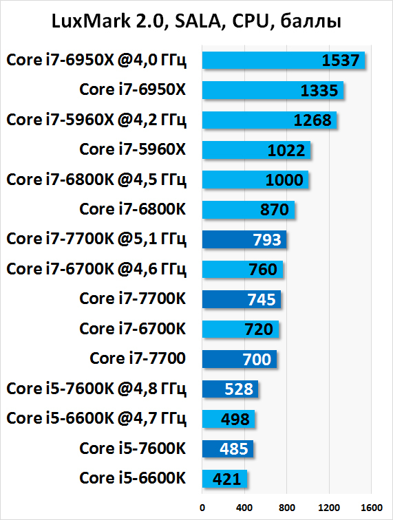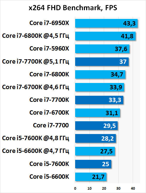 Наконец очень здорово во всех тестах проявляет себя Core i7-7700. Напомню, процессор работает на частоте 4 ГГц в многопоточных приложениях. А потому гордо держится за Core i7-6700K.