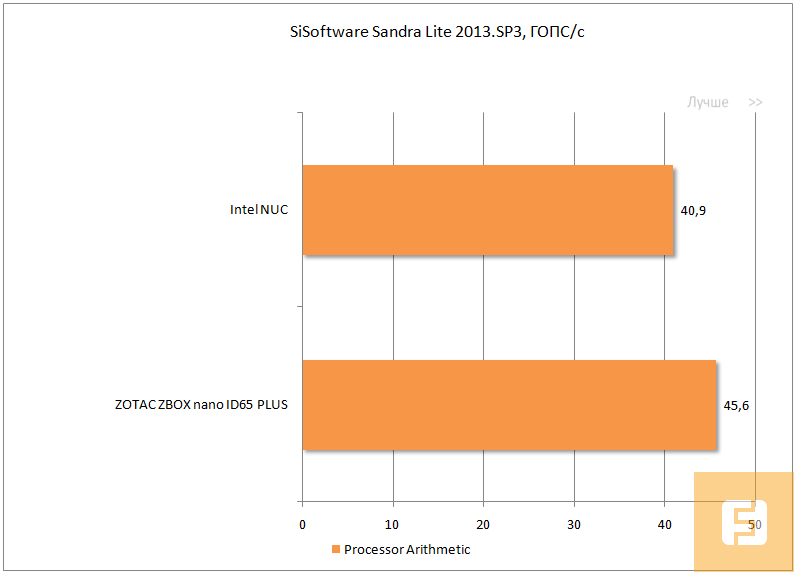 Как вы уже заметили, компания ZOTAC оснастила свой неттоп более производительным CPU. Не удивительно, что в процессорозависимых тестах ZBOX PLUS NANO ID65 оказывается победителем. Но NUC имеет преимущество в виде возможности установить два модуля оперативной памяти, что может повысить производительность интегрированной графики приблизительно на 30%. К сожалению, в тестовом стенде использовалась лишь одна плашка DDR3-1600 емкостью 4 Гбайт.