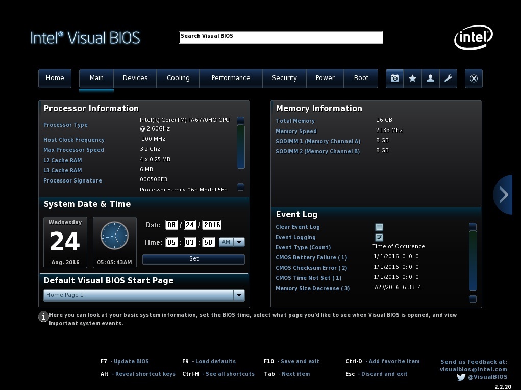 BIOS мини-компьютера, и это меня приятно удивило, оснащен большим количеством функций. Вы можете настроить работу множителей процессора и памяти. Максимальный для Core i7-6770HQ — х35 для одного ядра. Официально, как мы знаем, контроллер памяти поддерживает модули оперативной памяти DDR4-2133, но пользователь вправе выбрать другие делители. Я без особых проблем запустил кит на эффективной частоте 2400 МГц и 2666 МГц. Здесь же настраивается работа вентилятора системы охлаждения. Есть возможность «поиграться» с напряжениями.