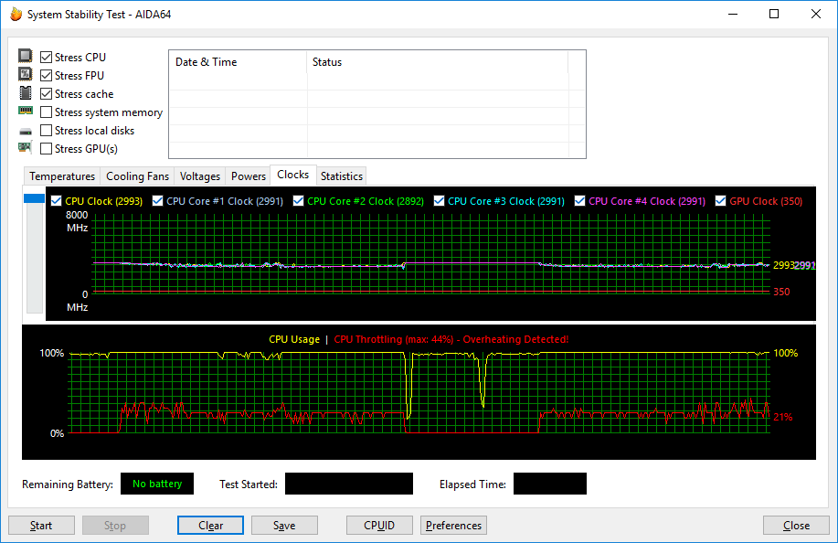 LinX 0.6.5, очевидно, положил Core i7-6770HQ на лопатки. Все четыре ядра моментально прогрелись до 100 градусов Цельсия. Их частота снизилась в среднем до 2800 МГц. Максимальный уровень троттлинга составил 43%. Отмечу, что подобный паттерн работы маловероятен. Все же стоит ориентироваться на игровой режим.