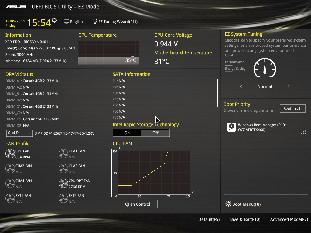 В итоге Core i7-5960X был оверклокнут до 3977 МГц, а «мозги» — до 2447,6 МГц. Если честно, то получилось как-то маловато. Видимо, система разгоняет компоненты ПК с большим запасом. Мои слова подкрепляются тем, что автоматически было выставлено щадящее напряжение в размере 1,2 В. К тому же неясно, почему не был активирован второй профиль XMP, позволяющий работать киту ОЗУ на эффективной частоте 2666 МГц. Так что, на мой взгляд, лучше разгонять компоненты системы вручную, то бишь самостоятельно.