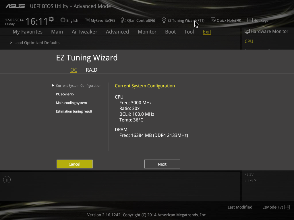Как мы уже успели выяснить, материнские платы оснащены большим количеством функций, позволяющим беспрепятственно разгонять железо. В наличии опция автоматического оверклока центрального процессора и памяти. Она получила название EZ Tuning Wizard. Пользователь может самостоятельно выбрать, какой тип системы охлаждения установлен в его компьютере, а BIOS подберет необходимые частоты, множители и напряжения. Например, для необслуживаемой СВО было принято разогнать центральный процессор на 32% и оперативную память на 14%.