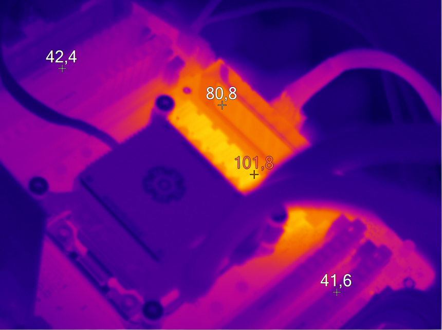 А вот наличие дополнительного элемента охлаждения в виде медной теплотрубки у X99-S позволило значительно снизить температуру околосокетного пространства. Максимальный зафиксированный показатель — 81 градус Цельсия.