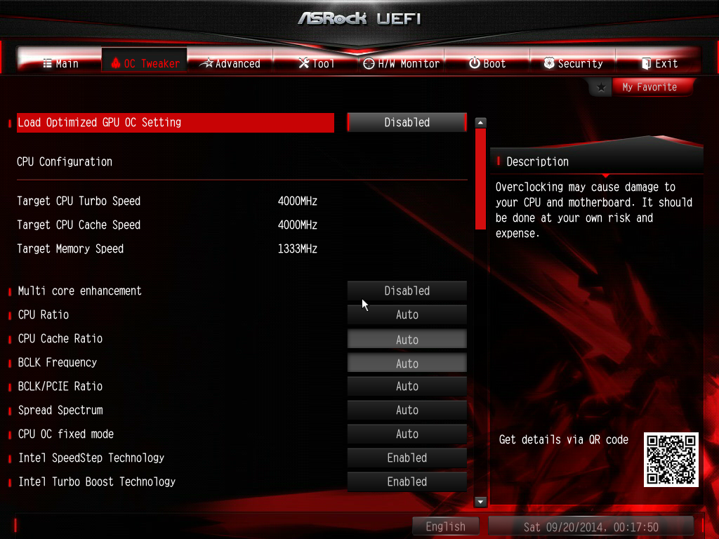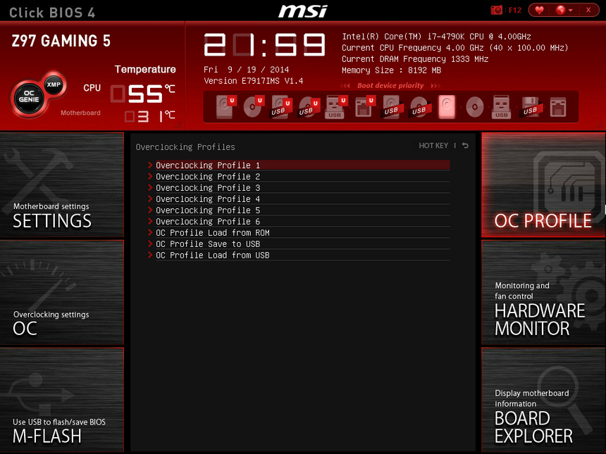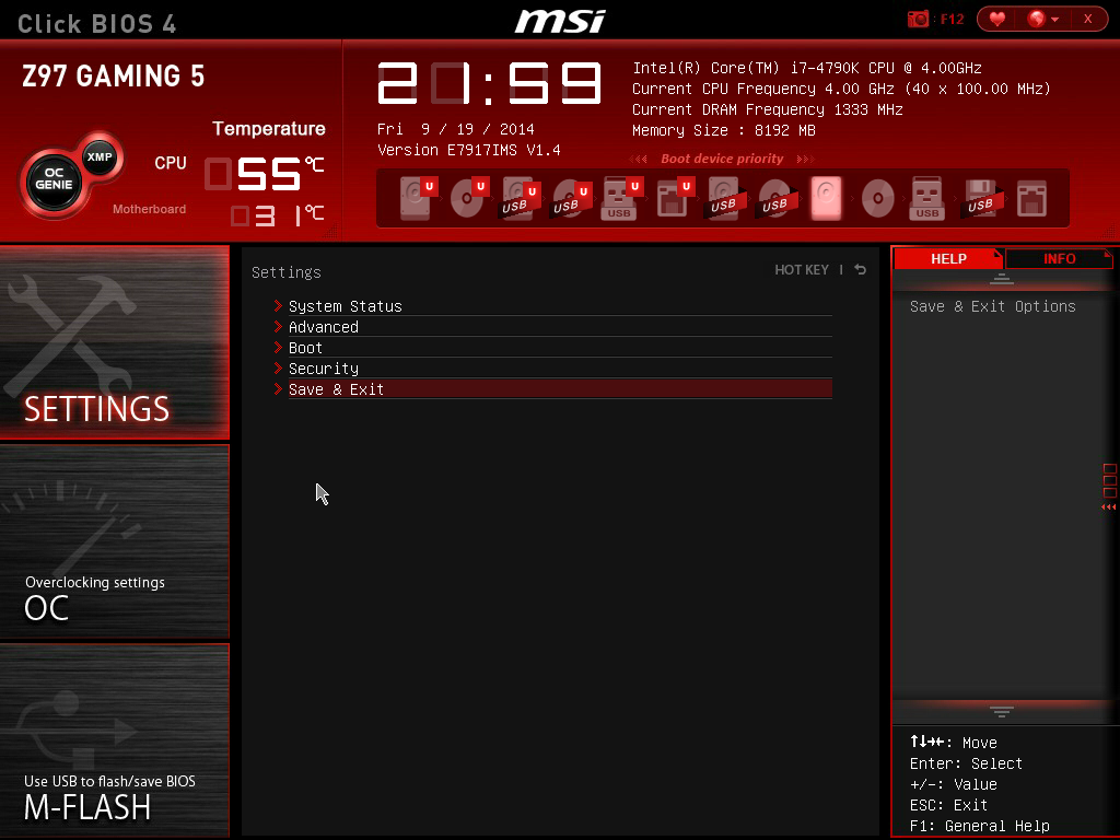 Прошивка Z97 GAMING 5 под названием Click BIOS 4 уже хорошо нам знакома. С полным списком ее возможностей вы можете познакомиться здесь. Не буду повторяться. Только отмечу, что она обзавелась собственным скином, более подходящим для линейки GAMING.