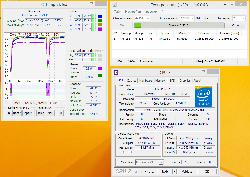 Я уже отмечал, что матплаты обладают всем необходимым для разгона железа. В качестве подтверждения привожу пример оверклока Core i7-4790K до стабильных 4700 МГц при напряжении 1,3 В.
