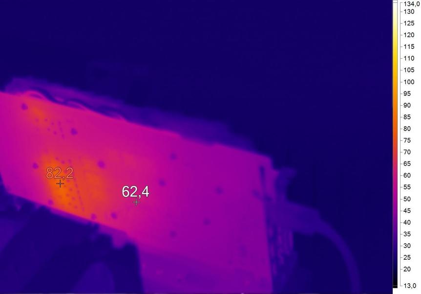 Самым горячим местом на плате является подсистема питания. Со стороны выводов она прогревается до 82 градусов Цельсия. Референс «отжигает» заметно . Только не забывайте, что у GeForce GTX 1060 GAMING X 6G есть металлический бекплейт. Он не дает высоким температурам греть расположенные по соседству комплектующие.