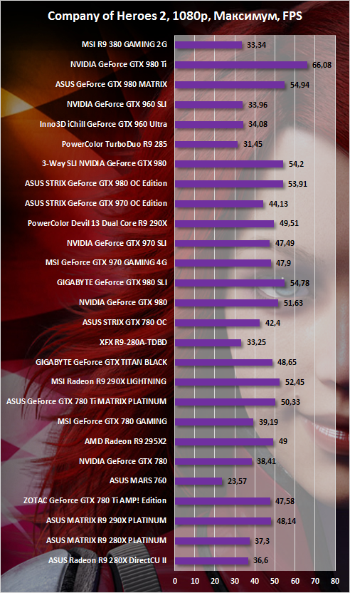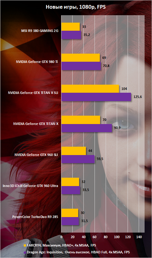 Впрочем, хватит математики. Все цифры отображены в сравнительных графиках. В целом во всех играх, используемых в тестировании, наблюдается схожая картина. А именно в большинстве случаев (если быть более точным, то в семи из десяти) R9 380 GAMING 2G быстрее Inno3D iChill GeForce GTX 960 Ultra. Где-то всего на 5%, где-то на 10%, а где-то и на целых 20%. Разница небольшая, но она есть. Что, конечно же, дает вистов новинке.